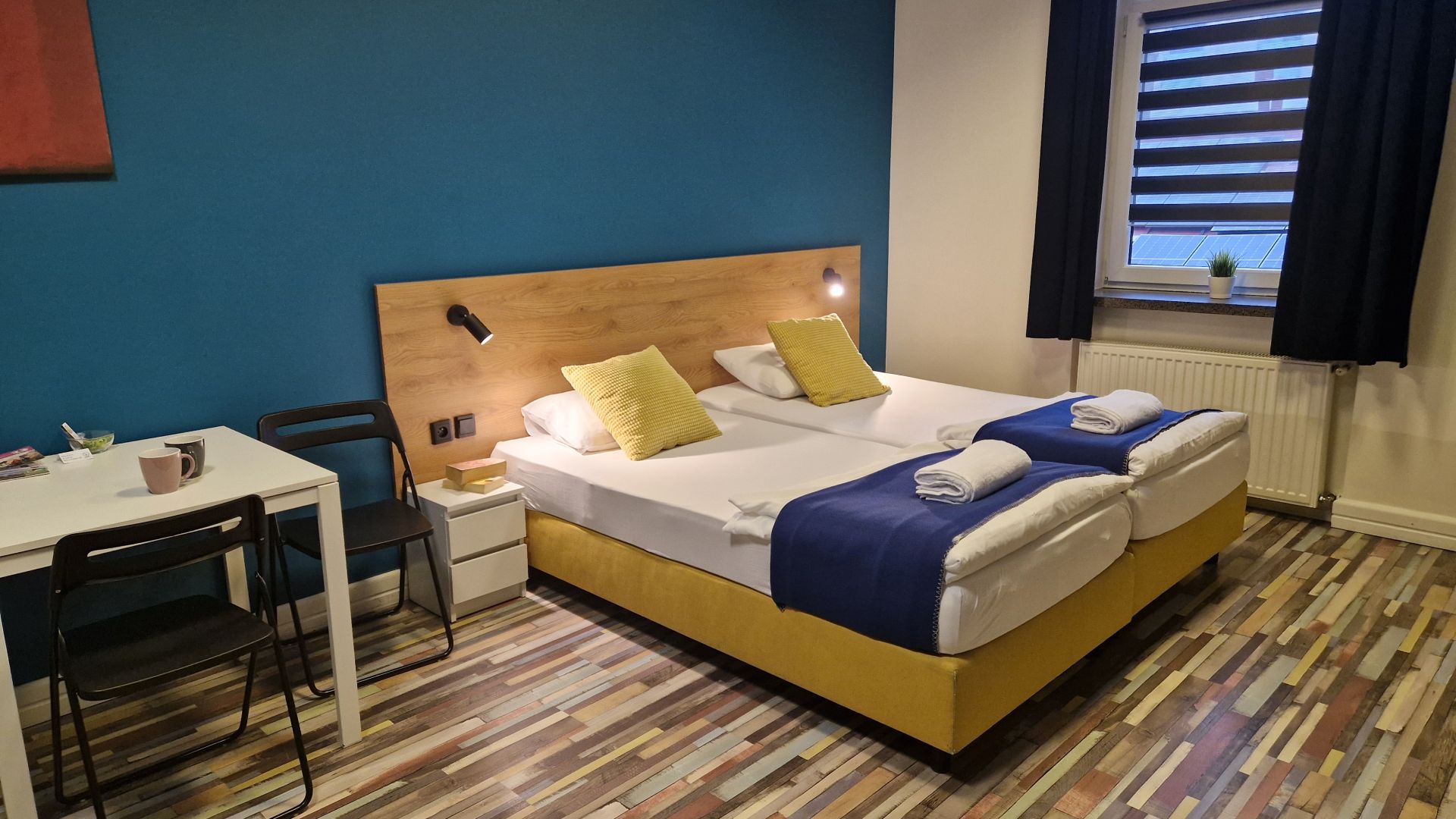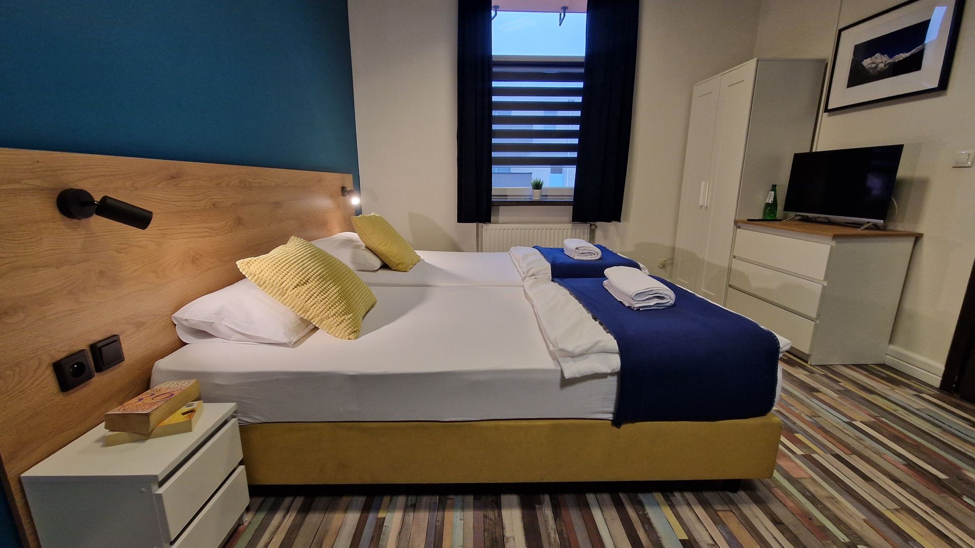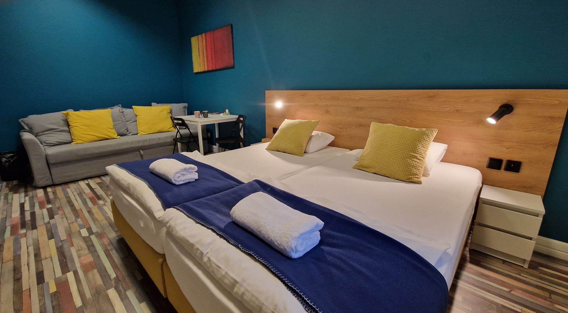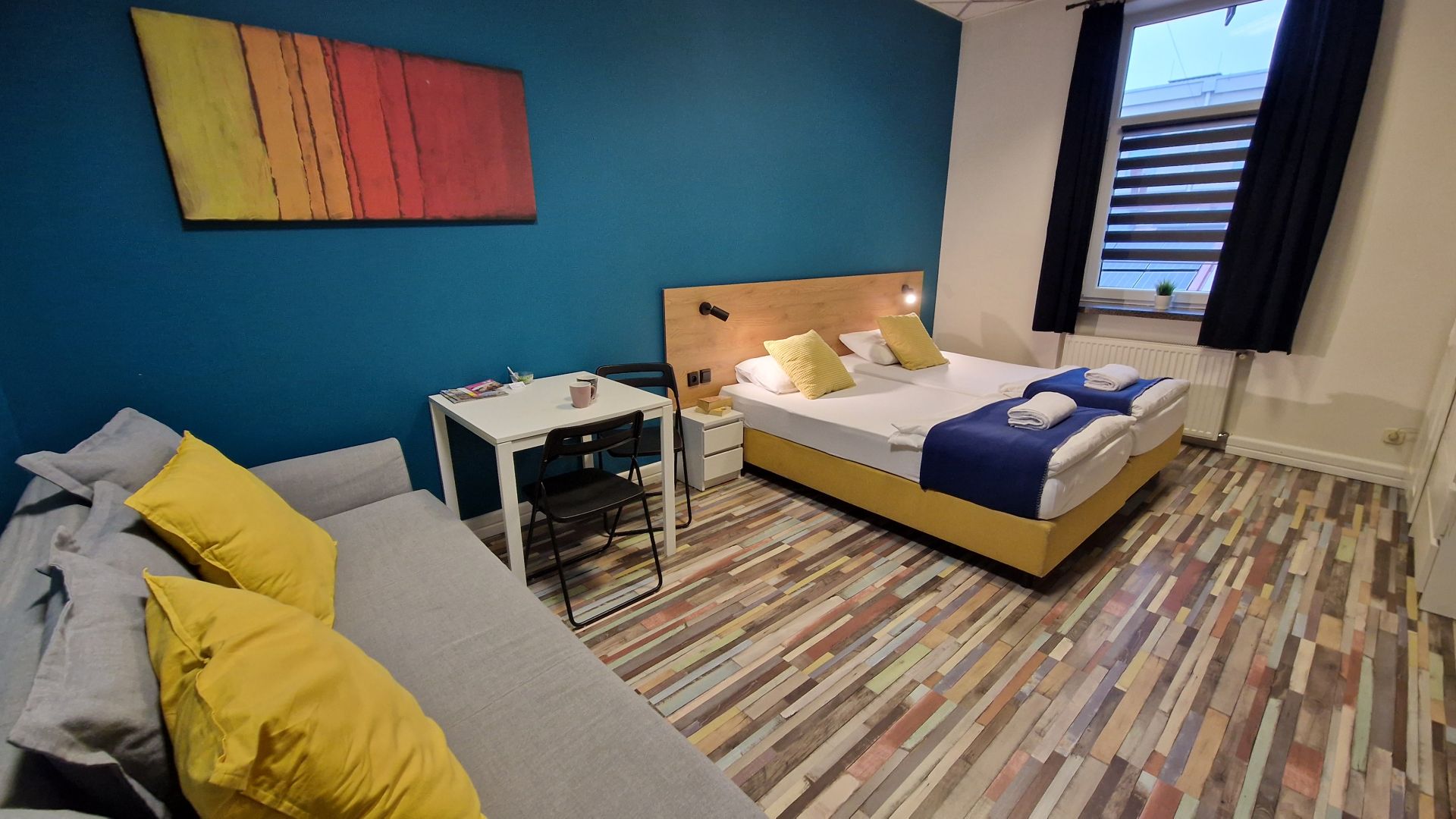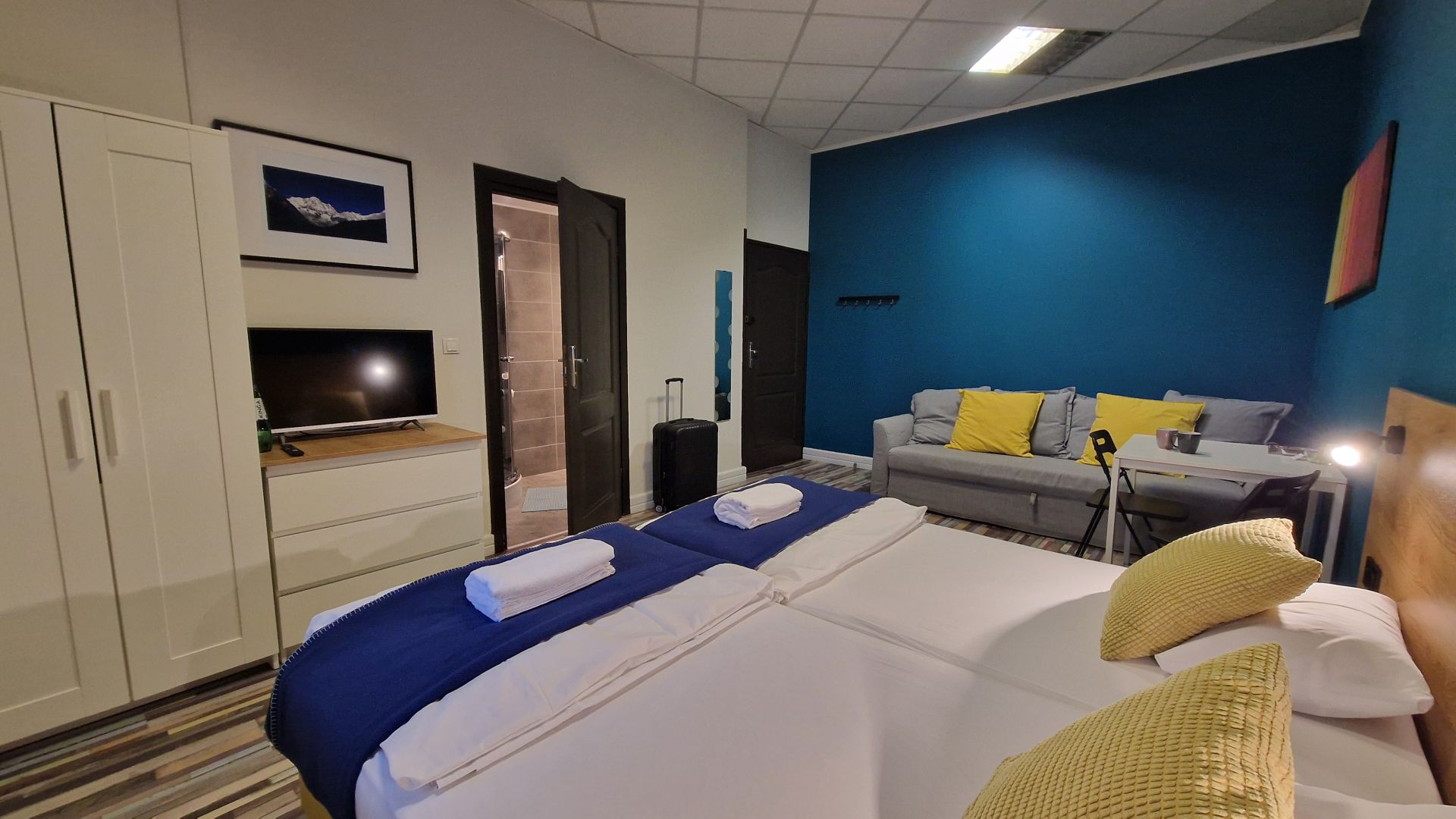 Przestronny pokój o powierzchni 25 m², idealny dla rodziny lub grupy do trzech osób. Posiada dwa połączone łóżka 100 × 200 cm oraz rozkładaną sofę 160 × 200 cm, która daje dodatkowe miejsce do spania.